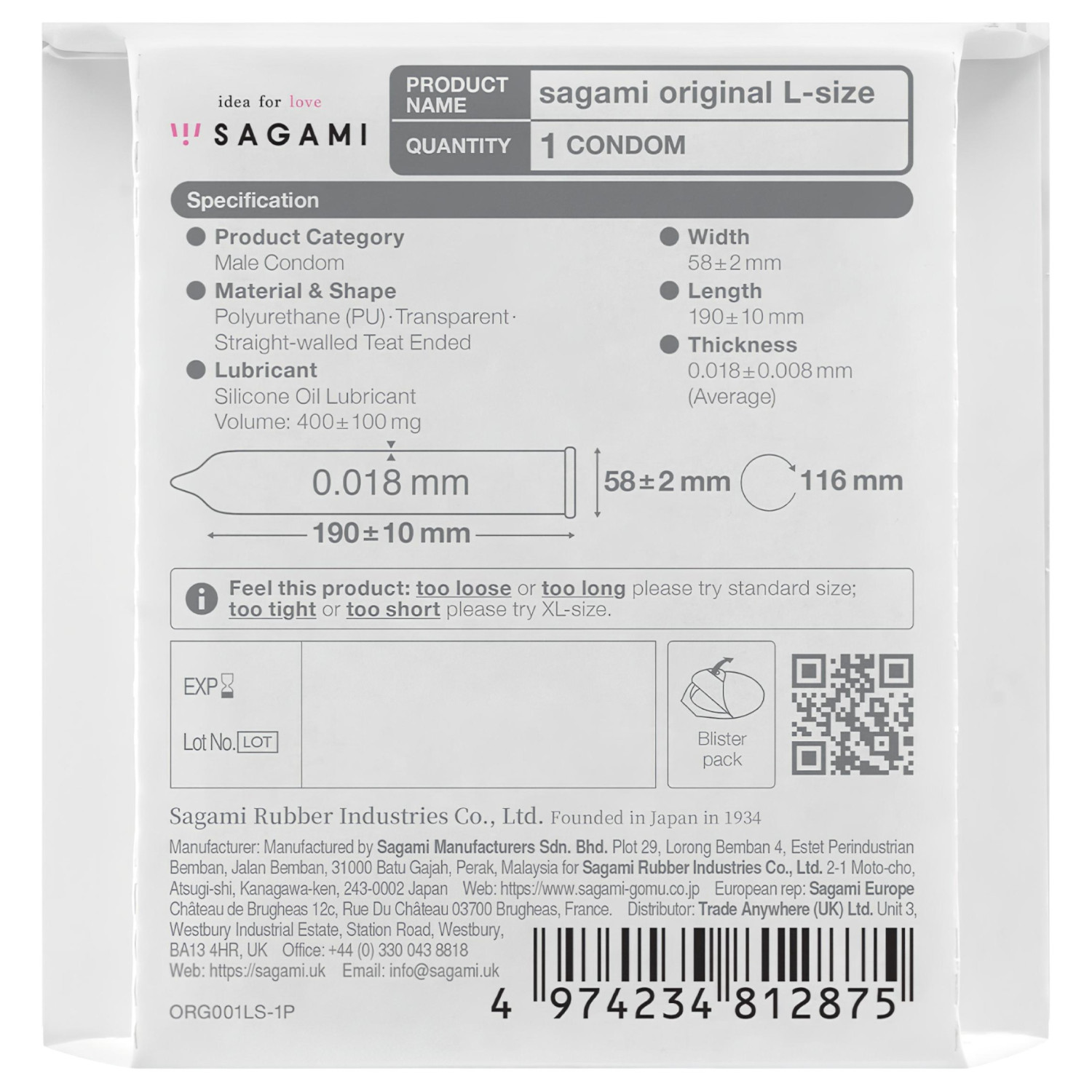 • 1 ks Sagami Original 0.01 L-Size kondóm